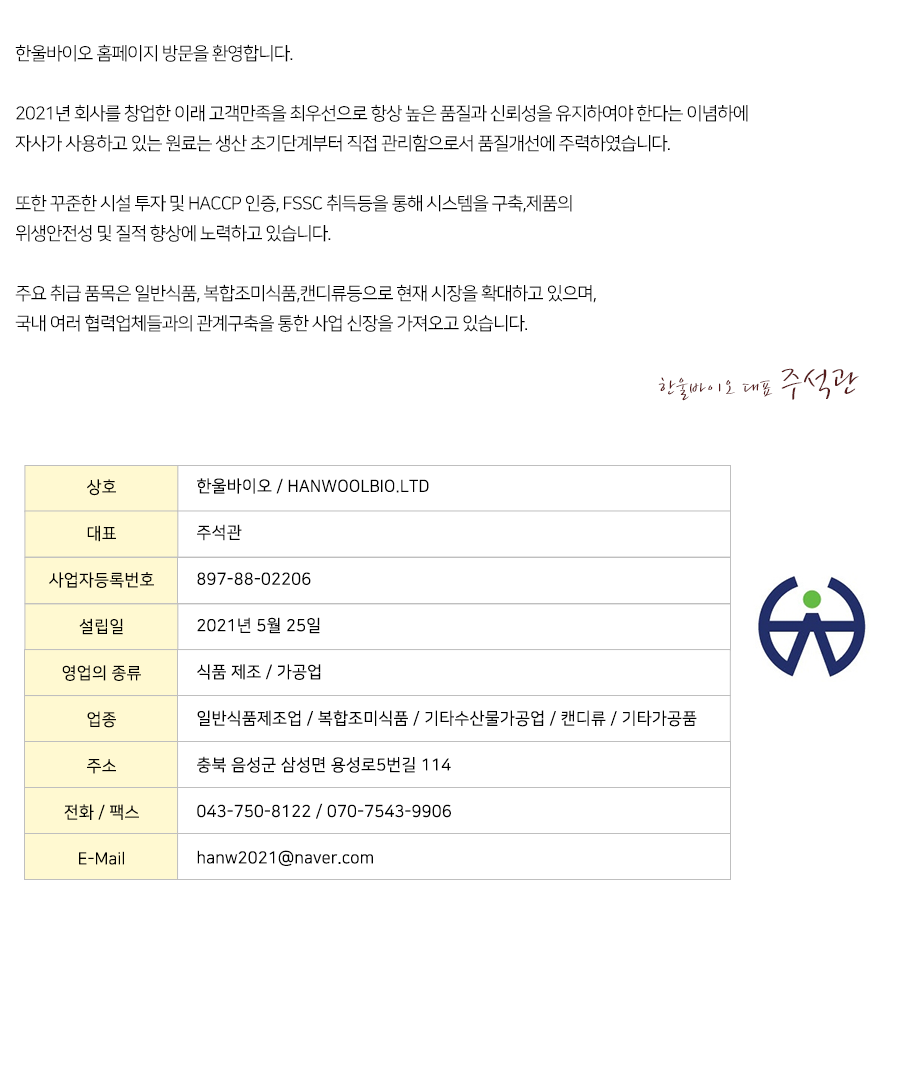 주소 : 충북 음성군 삼성면 용성로5번길 114 (주)한울바이오